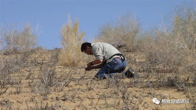 由于我做的是全流域研究,所以我必须要从山上下来进入荒漠,因为荒漠是山地河流的尾闾区。于是,我就到了沙漠,俯下身子开始寻找我所需要的苔藓植物。