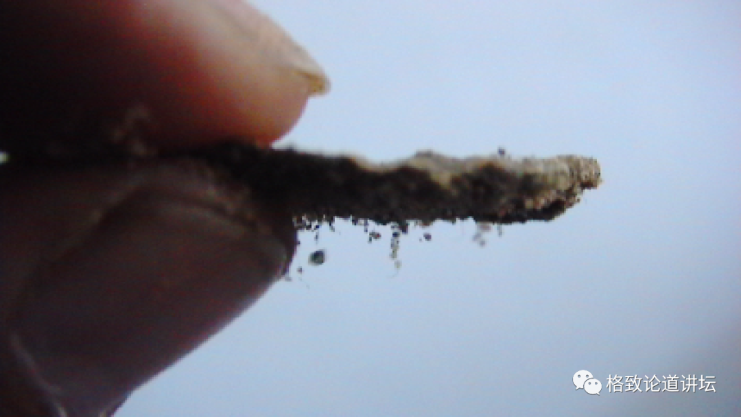 这个薄层非常神奇。为了弄清楚它的结构,我们从野外把这个薄层取回到实验室进行观察,结果发现薄层内大有乾坤。简单从这张照片来看,沙粒好像被什么东西包裹着、牵引着,彼此连接成了一个整体。
