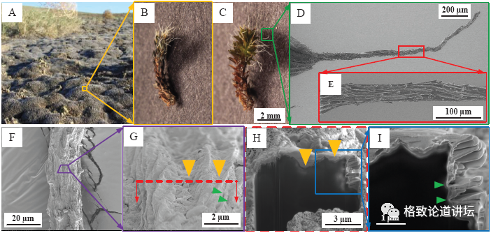 对于苔藓植物来说,其顶端的白色芒尖不仅仅是“防晒霜”,它还能起到输水管的作用。下方这组照片反映的是在不同尺度下的芒尖结构。将其尺度缩小到微米和纳米级的时候,我们发现,从生物力学角度看,白色芒尖里有很多在纳米尺度修饰过的结构。