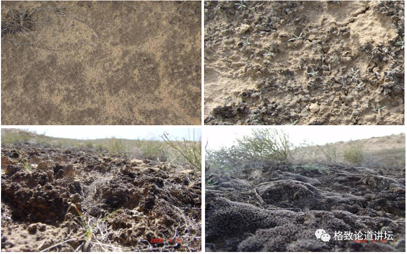 从学术角度来讲,沙漠“皮肤”应该被称为生物土壤结皮。沙漠“皮肤”到底长什么样子?就长这个样子,这是它的4张“众生相”,有平的,有皱的,有黑的,有黄的。