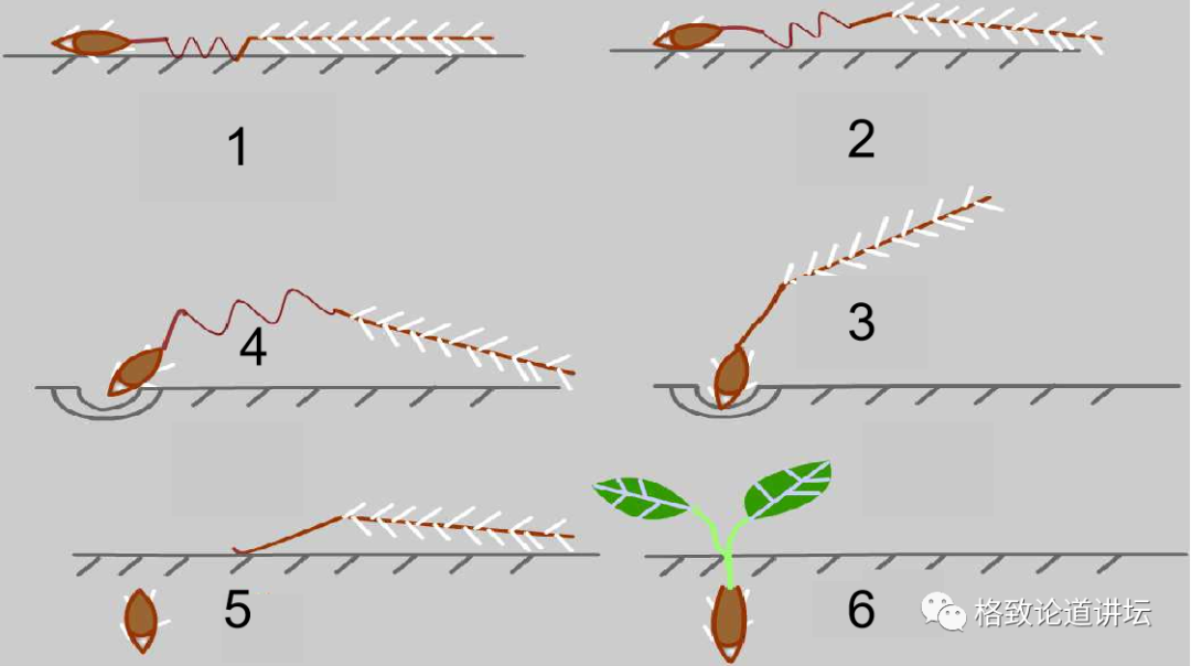 同时,“羽毛”前面的螺旋受到水分的浸润时,会逐渐解开、伸直。再加上不断随风旋转的“羽毛”,种子最终能够完整地穿透结皮,进入土壤中。