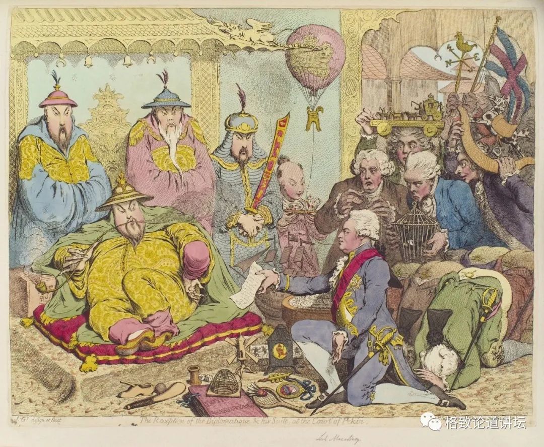这幅绘画收藏在英国,是由英国画家詹姆斯·吉尔雷在1794年绘制的,它描绘的是中英文化交流史上最为重大的一次事件。大家如果喜欢看《百家讲坛》或者听评书的话,可能不止一次地听过这段历史,就是马戛尔尼觐见乾隆。