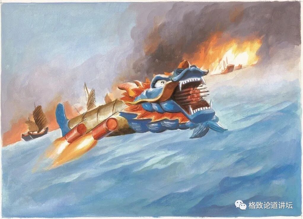 这幅绘画所描绘的是中国明代的火龙出水,它被誉为世界上最早的两级火箭,美国人更是尊敬地称它是“战斧”(世界上第一枚巡航导弹)的祖先。