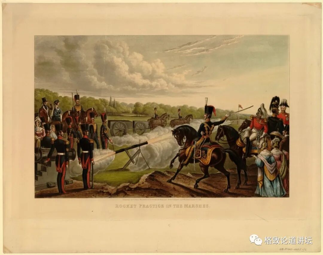这幅绘画描绘的是1842年中英《南京条约》签署时,英国皇家炮兵的火箭支队进行演练的场景。在这幅绘画绘制完成的18年之后,这枚火箭回到中国。