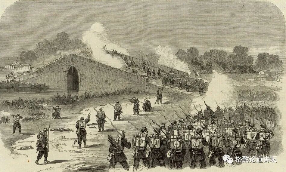 当时英法联军在中国战场一共打了四仗,第一仗是大沽口登陆,第二仗是张家湾之战,第三仗八里桥之战也就是火箭之战,第四仗攻克北京。