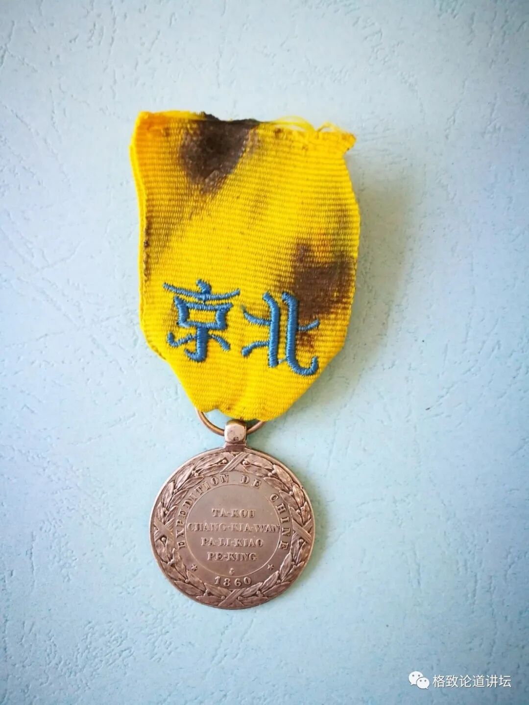 这枚奖章是当时法国皇帝拿破仑三世颁发给法国官兵的纪念品。这枚奖章也是我本人的收藏品,它上面刻着几个名字,其中一个就是八里桥。