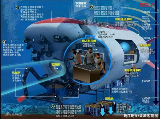 这个就是咱们的蛟龙号,和国外相比除了我们下潜深度最深之外,我们还有三个比较领先的技术。