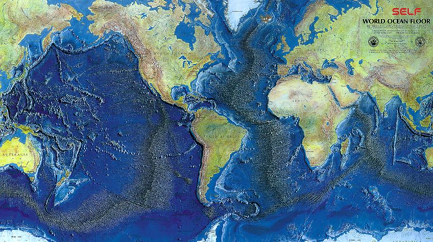 这一张图实际上是借助了近年来最新声纳技术的发展,才能够绘制出来一张全球的海底地图,那么大家可以看到这个海底地图里面有很多这种像黑的,实际上都是海底的板块之间的裂缝,这些裂缝里面不断地有火山活动,有岩浆涌出来,它在不断地扩张,这个地方底下有很多科学问题是需要科学家到去研究的。