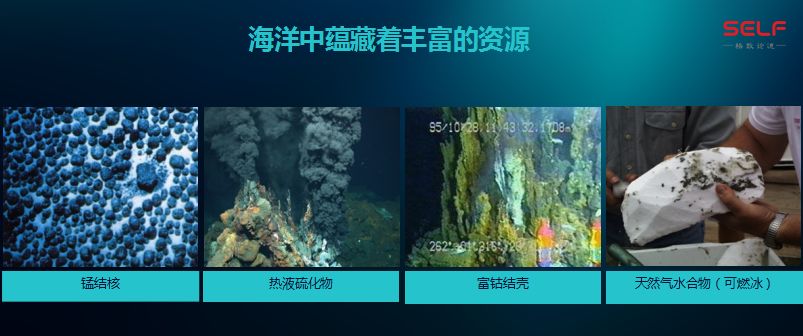 海底还有什么?大家可以看到就是我们这列了四种:最左边的这一个这个是叫锰结核,一个个像小土豆一样的里面富含着金属成分。有的还大一点,有拳头那么大的矿物,是含有很高的金属成分。