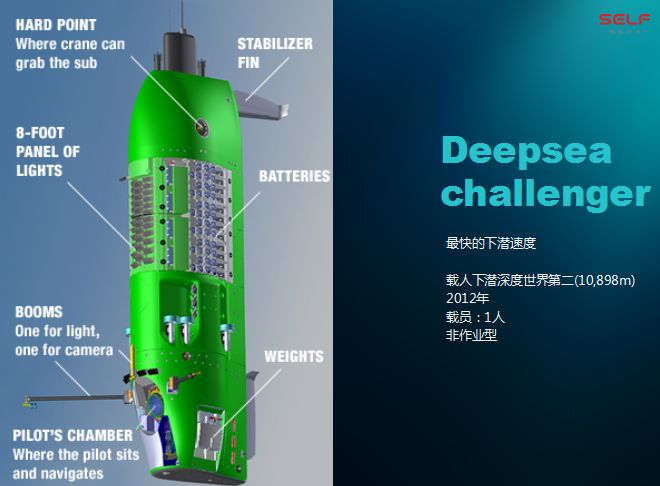 下潜深度第二的是美国导演卡梅伦,在2012年他自己出钱造了这么一个潜水器,它的样子比较怪异。他下到了10898米,本来他是想下去拍电影的,所以它上面灯光摄像机比较多一些,但是下去之后实际上就坏掉了,基本上就没干成什么事。他虽然也拍一个电影回去,但是这个效果从这个潜水器的效果来讲,并不是太好,真正意义上不是一个能够作业的东西。