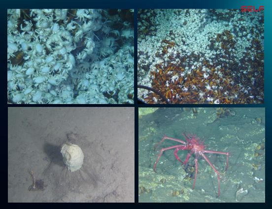 大家可以看到这照片上面的是热液区的,下面是冷泉区的,大家看到这些贝壳、螃蟹,虾可能看着都很眼熟,不是什么稀奇古怪的东西。所以它的生命形态的话,虽然它的类型完全不一样,有的是咱们大家熟知的,可能是基于阳光的生态系统基于热液的和基于冷泉的,它们都很相似,那么它的基因学上的一些科学问题,这都是需要科学家去解决的。