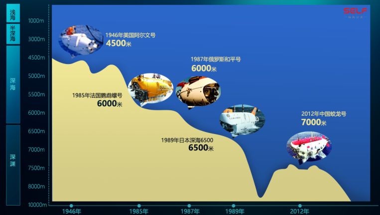真正下到海底能够作业的潜水器是这么五个。最左边的是美国的叫Alvin号,虽然它的深度在这里面是最浅的4500米,但是它实际上是所有的载人潜水器当中取得的成是最大的,下潜次数最多、发表论文最多、科学发现最多,所以它是我们大家公认最成功的一个。像法国的鹦鹉螺号、俄罗斯的和平号是6000米的,日本造了一个是6500米的,咱们中国造的蛟龙号是7000米,在这个级别里我们是最深的一个。
