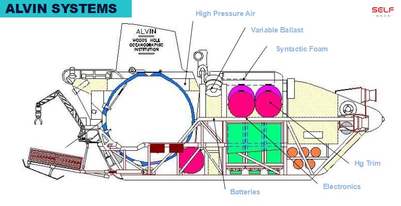这几个潜水器因为功能都相似,都是带着三个科学家下去做科学研究调查等等,所以它们在设计理念上其实是相似的。以这个美国的Alvin号潜水器,我们举个例子来说明一下。