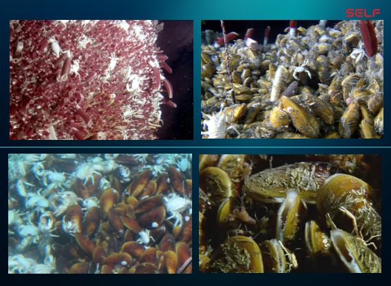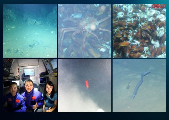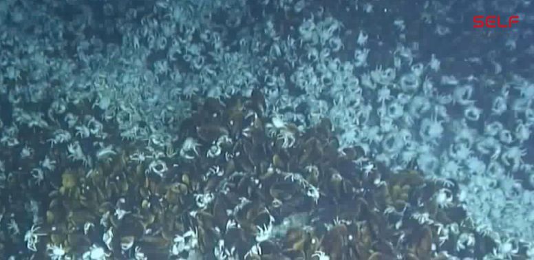 这就是2013年蛟龙号,在我们命名叫蛟龙冷泉的海区所拍的一段录像截图。大家可以看到密密麻麻的全是贝壳 ,白的叫白瓷蟹,里面还有一些虾。还有一些大的螃蟹,量非常大。
