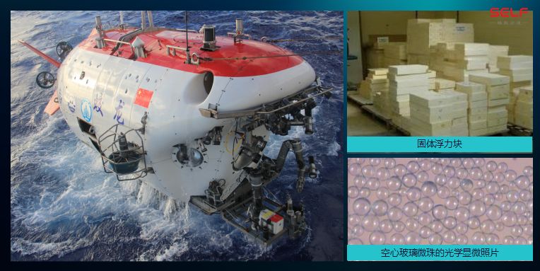 什么样的东西能够承受那么大的压力呢?实际上我们用的是基于玻璃微珠的一个固体浮力材料,图上右下角是显微镜拍的这些空心的玻璃珠,它的直径从几个微米到一两百个微米组合起来的,它是空心的,很轻。然后用树脂给它粘起来就变成这么一个块,这个的密度大概是零点五几,可以承受七千米的压力。