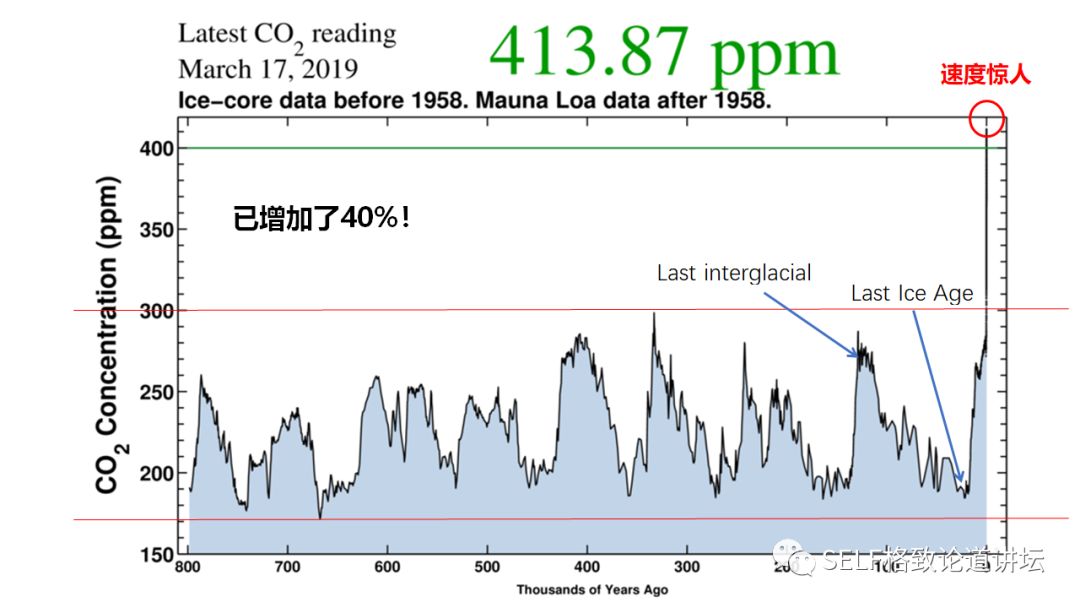 我们一起来看看这张图的相关数据,过去80万年以来,二氧化碳的水平一直在100ppm-200ppm之间。但工业革命以来短短的两三百年,二氧化碳的值就达到了另一个高峰,已经增加了40%。