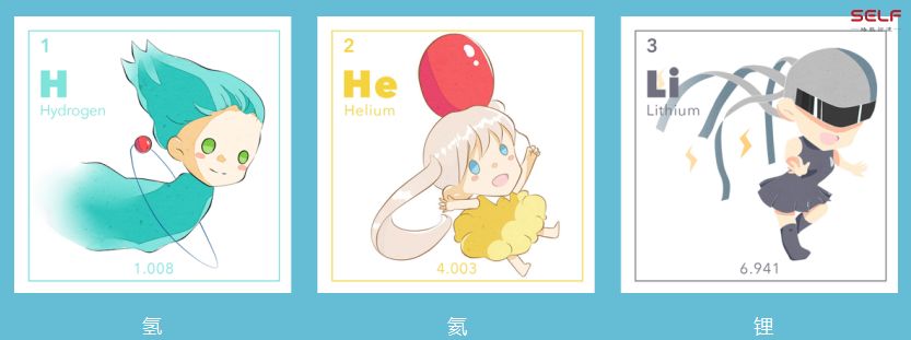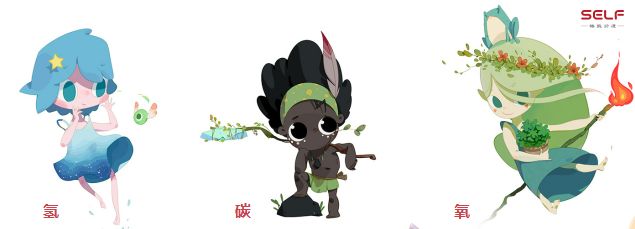 这是第一版的角色设计,我们想用插图的形式来展现这些元素的性质,而不是用枯燥的文字的叙述。比如氢通过核聚变为太阳提供能量;氢是最轻的气体;氢如果丢掉电子的话,它在水溶液里边就会变成酸。