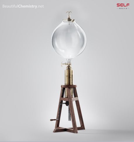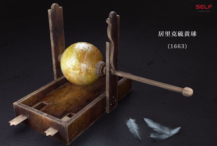 这个是其中一个叫做居里克的硫磺球。它应该是最早的一个摩擦起电的装置。很有意思的一点是,居里克本人并不知道他发明了这种摩擦起电的装置。他认为这个硫磺里边带有地球的某种特性,通过摩擦之后,它就能把这种特性激发出来,就像地球吸引我们这些人,有引力一样,它也吸收微小的物体。