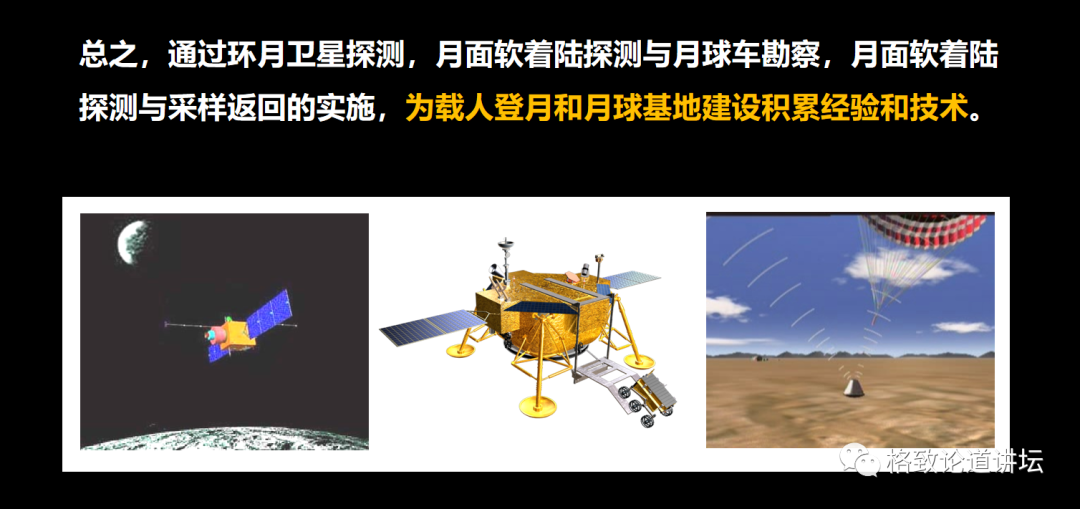 这些是我们已经进行的绕月探测、落月探测和取样返回,都是为了我们人类能够到达月球、充分地开发利用月球的准备工作。