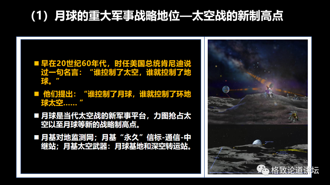 当时美国总统肯尼迪说:“谁控制了太空,谁就控制了地球”。后来美国人登月了,他们就说:“谁控制了月球,谁就控制了环地球的太空”,因而谁就控制了地球。