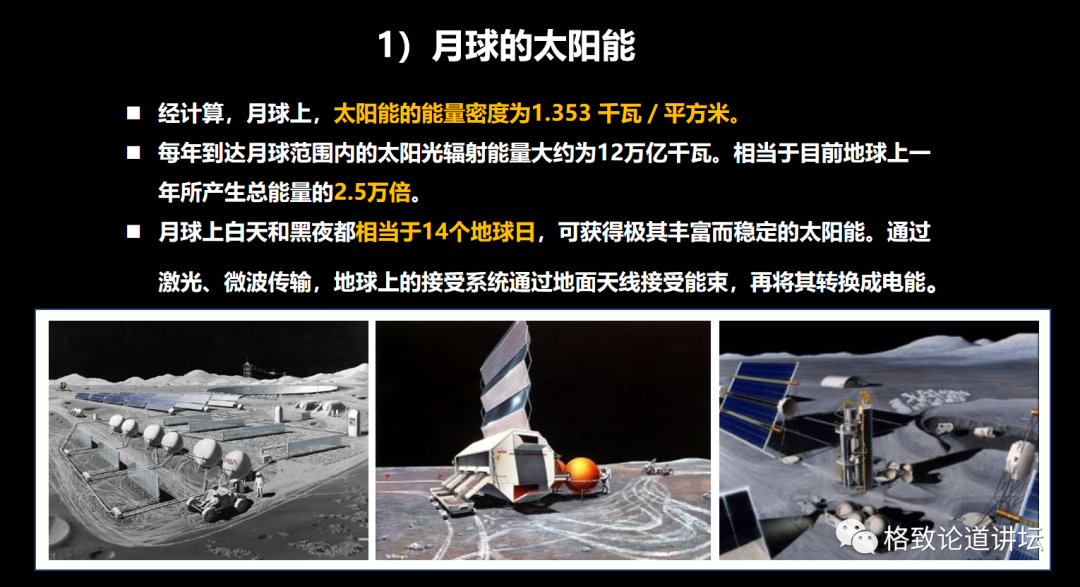 首先来讲月球上的太阳能。月球有一个特点,它没有大气,不刮风不下雨,没有气候变化,太阳一出来就会直照月球表面。同时月球是自转的,它28天多自转一圈,所以它的一天接近一个月,白天和晚上都相当于半个月。