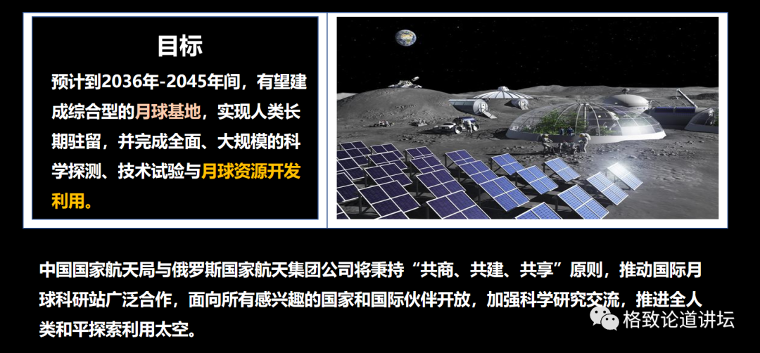 中俄合作建设的国际月球科研站准备在2036年到2045年间建成一个月球基地,实现人类的长期驻留。而且这个月球基地能够全面地、大规模地开展月球的科学探测和技术试验,对月球资源、能源进行开发利用。