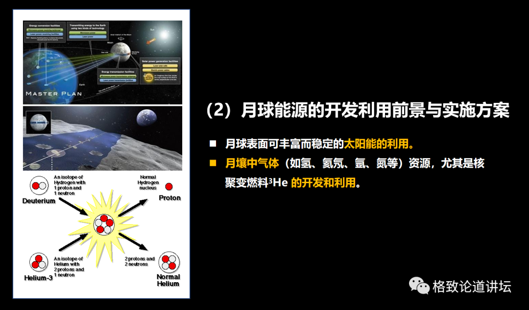第二就是月球的能源。月球大概有两种重要的能源:太阳能和月球土壤里的一种成分。这种成分也许今后将推动人类社会的能源需求。