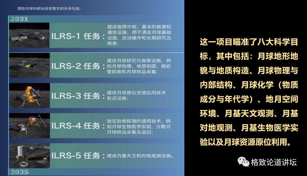 另外,我们这次合作的国际月球科研站有八大科学目标。我们要弄清楚月球的形成、演化和它的现状、环境,以及它有哪些资源和能源可以利用,来为我们人类未来的社会发展,提供一些非常重要的支撑。这些就是这次任务书里规定的国际月球科研站要完成的五大任务和八项科学目标,我们要一步一步地去完成。