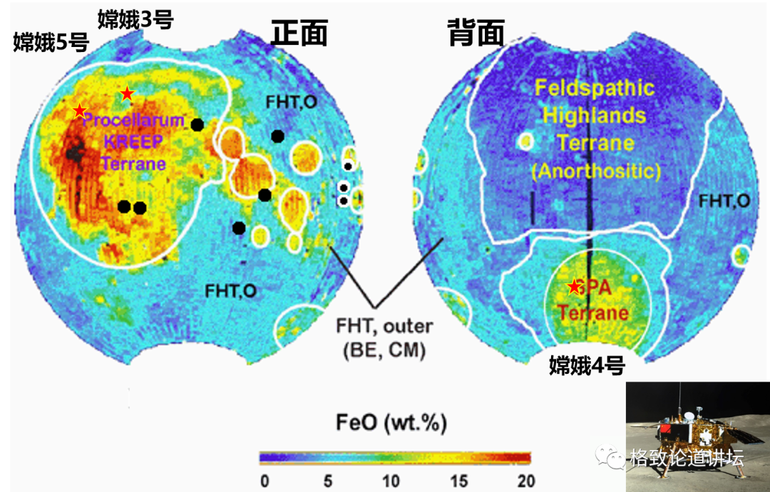 这张图通过对比月球正面和背面的氧化铁含量分布情况,我们可以发现月球组成是不均匀的。阿波罗号和前苏联采回的月球样品,都是在月球正面很小的区域内。月球背面以及其它地区的月球组成,就需要通过月球陨石来进一步分析研究。