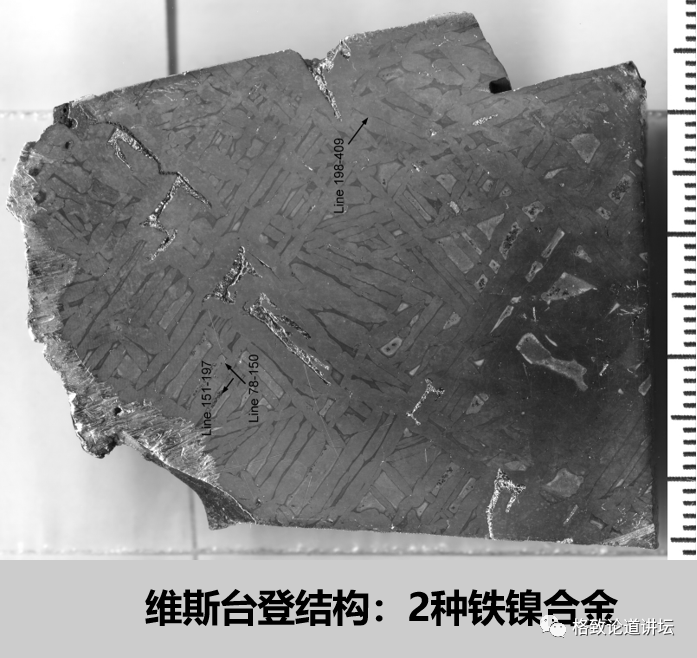 这个花纹实际上是由于两种不同的铁镍合金中镍含量不同,因此其抗腐蚀性不一样,就会出现这种花纹。这需要上百万年的时间慢慢冷却才能形成,所以在实验室中是没有办法仿制的。