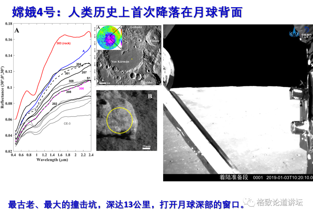 我国的嫦娥三号落在了月球正面,嫦娥四号是人类历史上第一次落在月球的背面,而且是落在一个很大很深的撞击盆地里面。