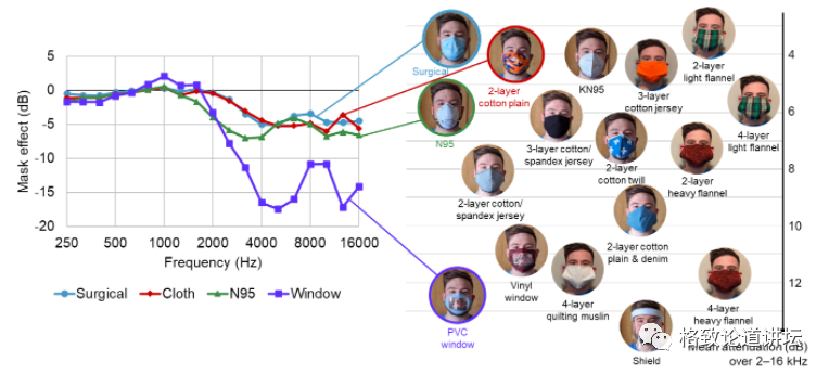 这张图是美国的一个科研院所做的口罩对语音影响的研究结果。他们分析得非常详细,分析了很多不同种类的口罩对语音信号的影响。从这张图上我们可以看到,戴上口罩对于语音信号的高频部分的衰减是比较严重的。从2000赫兹开始,衰减就比较严重了。