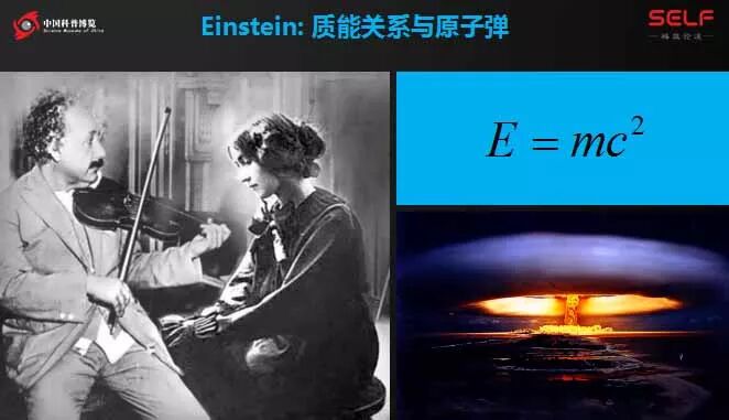 那么一个伟大的科学家,一个掌握最高科学秘密的科学家,是不是非要去创业呢?我想举一个很有趣的例子,1905年爱因斯坦基于对光速不依赖于发光体的速度这样一个事实,得出了一个非常重要的公式。这个公式相当多的书中理解应该是错的,有这样一个公式:E=mc2我们知道这叫质能关系,明白了质量和能量之间的这样一个转换,人们想到一个它在工程上的应用,就是制造原子弹。