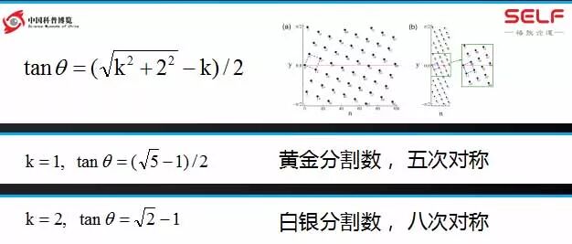 这个公式的K=1和K=2两项,把大自然里面的黄金分割数和白银分割数给统一起来了,而黄金分割数我们大家知道它出现在大自然的各个地方,它和五次对称性相联系,白银分割数和八次对称性相联系。