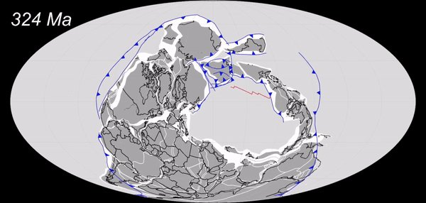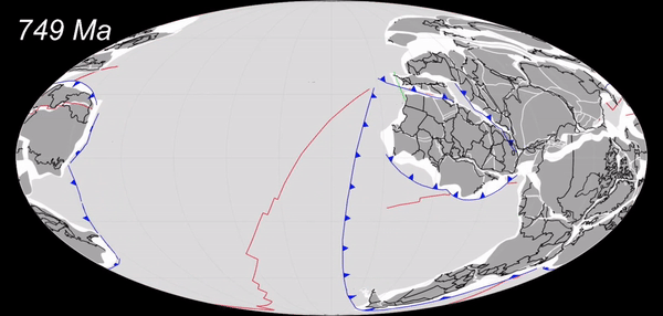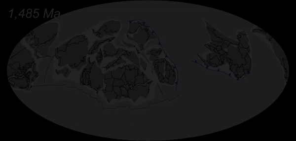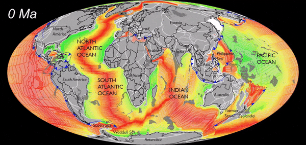 动图上一直在跳动的数字代表着时间,Ma代表百万年。从这张图我们往回看,可以看到超级大陆是怎么一步步裂解的。