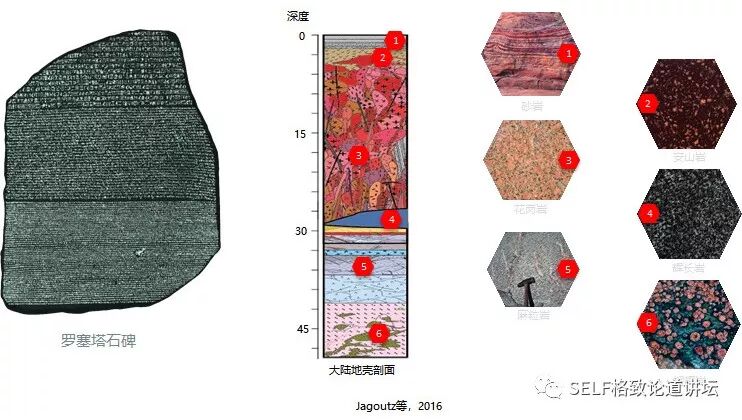 中间这张图是一个地壳的剖面,从上部到下部有很多不同类型的岩石。最上面是沉积物质,我们叫沉积岩,再下面有火山岩、花岗岩,最下面还有变质岩,每一层岩石记录的信息都不一样。