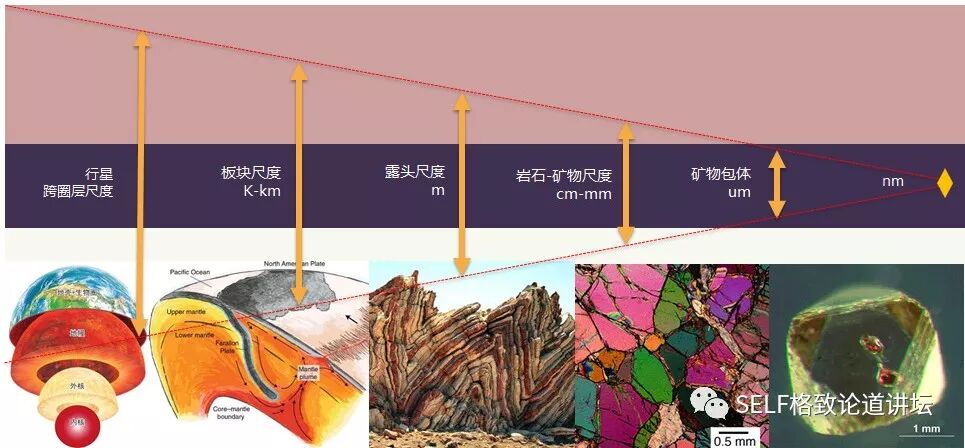 再进一步观测的话,就会集中到矿物和矿物包裹体的尺度,例如这张图最右侧是金刚石(钻石)。我们不仅研究金刚石,还研究金刚石里面的包裹体,它会携带丰富的信息。