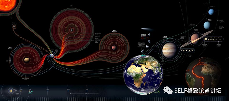 这张图展示的是美国国家航空航天局和加州理工空气动力学实验室,执行完的所有关于太空的人类探测任务。从左到右是太阳、八大行星依次排开。