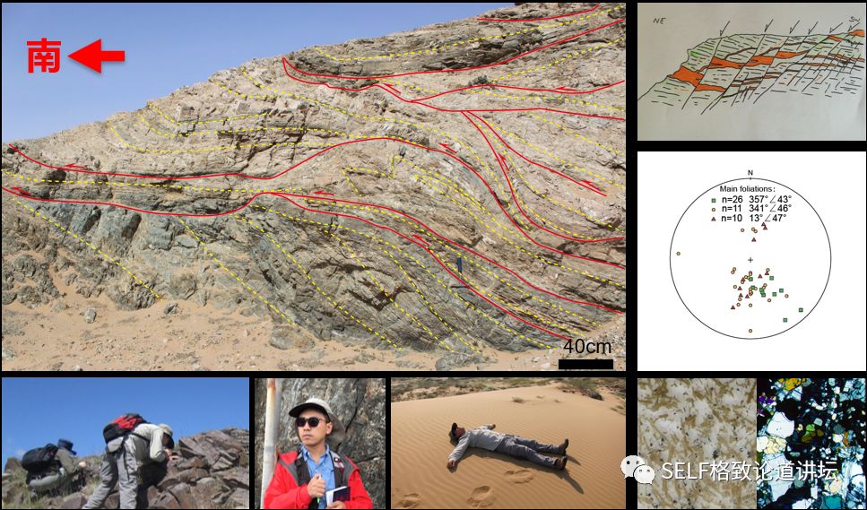 左上角图片中展示的是我们在野外经常看到的岩石的露头,中间有一个地质锤作为比例尺。对于普通人来说,这是一个比较无聊的岩石,地质研究者却觉得这些岩石非常非常有趣,因为它记录了很多很关键的信息。我们对这些岩石拍照以后,会把这些特别的信息都标记出来。