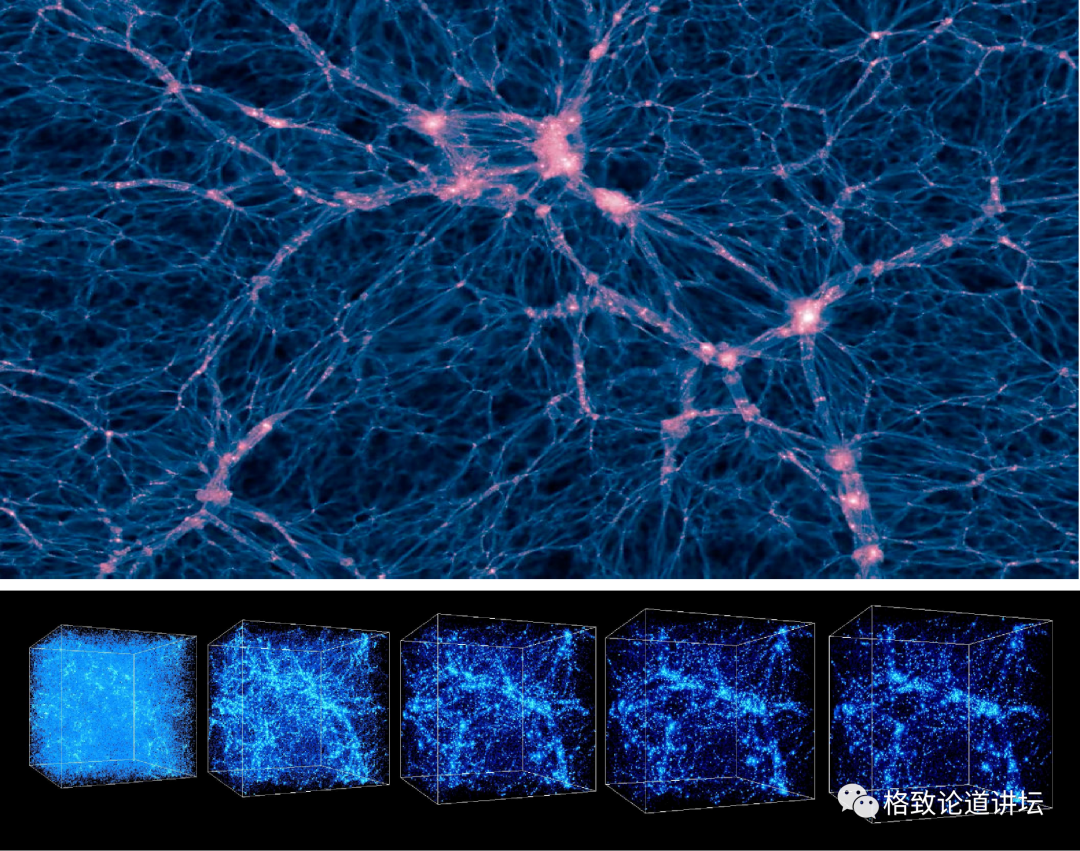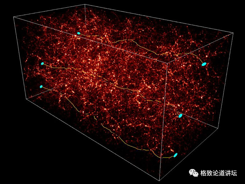 上面是一个示意图,我们去测量每一个星系的形状,然后进行一些数学分析、物理分析,就得到了右边这张红色的图像。红色里越亮的地方显示越多的物质,越黑的地方显示越少的物质。在非常大的尺度上,我们的宇宙布满了巨大的空洞和暗物质为主的巨大的纤维状网络。这里每一个空洞的大小都是我们刚才看到的那个璀璨的星系团大小的数十倍甚至上百倍。