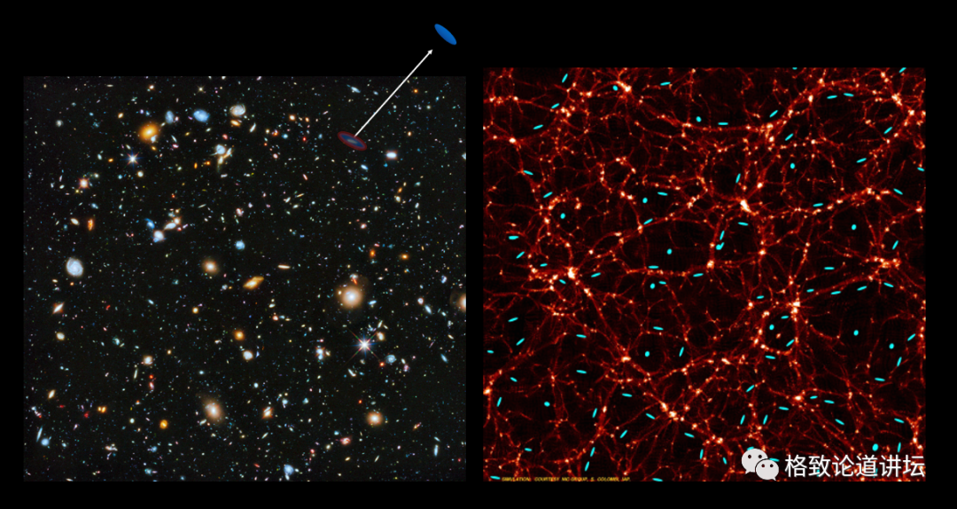 如果宇宙中没有暗物质、物质的话,这些星系的形状会是随机分布的。有的胖一点儿,有的扁一点儿,有的朝东,有的朝西。如果存在引力透镜效应,那么这些星系的形状、摆向就不是那么随机了。如果在一个小的天空区域里去平均这些星系的形状,你会发现它有一个残余。这个残余就标志了引力透镜效应的存在,同时也帮助我们去寻找暗物质。