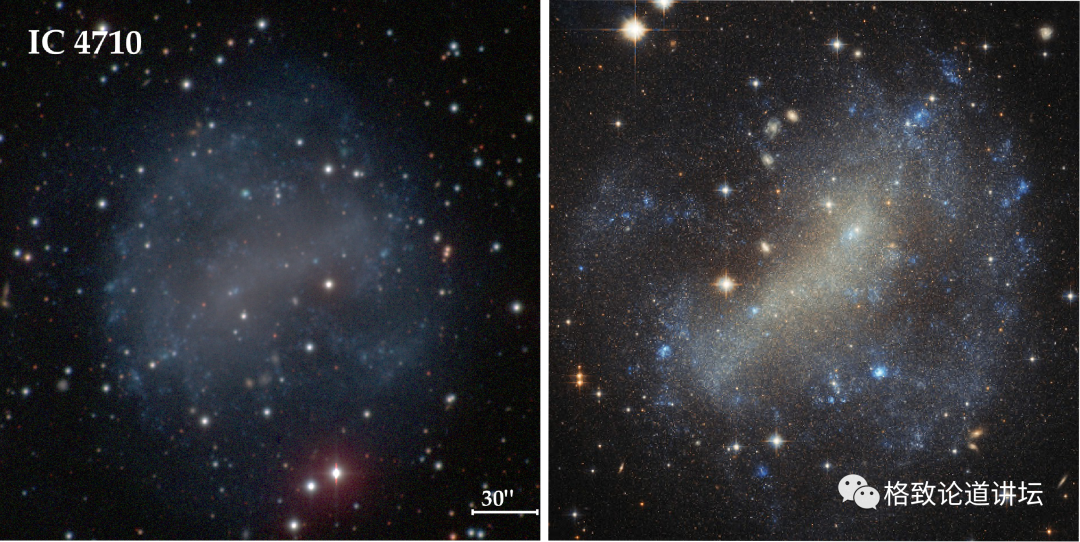 地面望远镜(左)和哈勃望远镜(右)观看的IC 4710星系