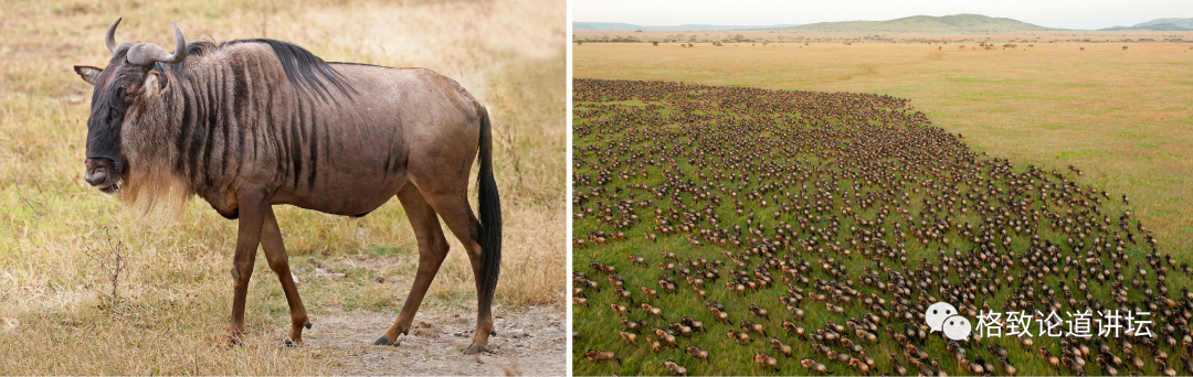 其实是有办法的。下面左图是一匹角马,它是生活在非洲草原上的动物。如果拿一个长焦镜头去观察它,我们可以把它观察得非常细致。但是非洲草原上可能有成千上万的角马,它们在这个草原上要迁徙,那么想研究它们的迁徙怎么办?我拿一个广角镜头去拍摄,就是下面右边的这个图像。