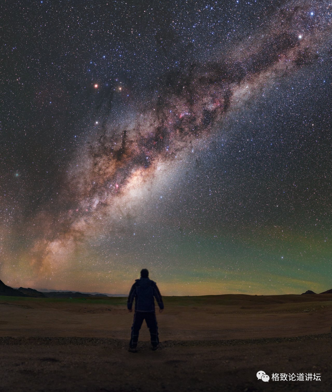 从下图中,我们可以看到:一个人站在荒漠上看向远方的时候,他看到的是非常美丽的银河横亘在天际之中。
