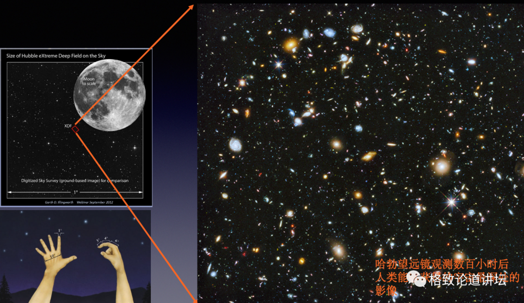 没有什么比哈勃望远镜超深场图像更能够说明哈勃望远镜的威力。如果我们伸出自己的手,食指的指甲盖大概能够挡住一平方度的天空。如果你把手伸直,手指甲盖刚好可以挡住月球,也就是说月球的面积稍小于一平方度。