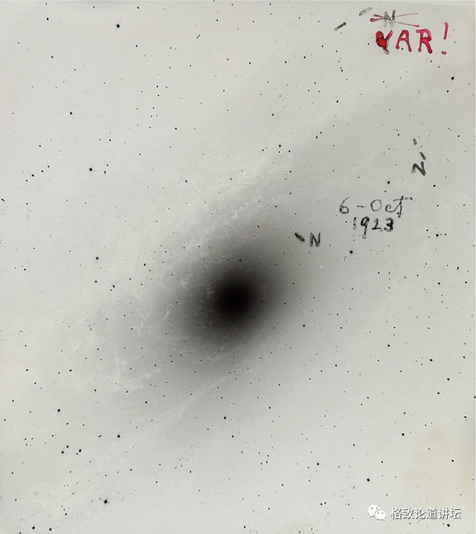 哈勃在这张照片的右上角用红色标注了三个字VAR。VAR指变星,这颗星的光度在周期性的变化。这颗星的距离是可以测定的,对它的测量改变了我们对宇宙认知的历史。