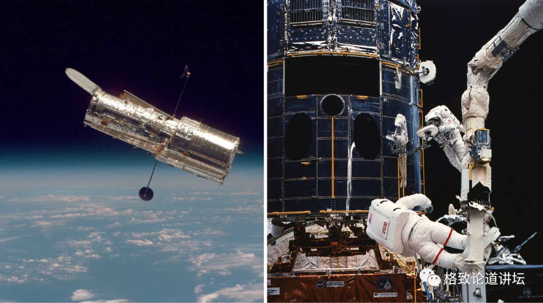 放在太空轨道上的哈勃望远镜(左)和进行太空维修作业的航天员(右)