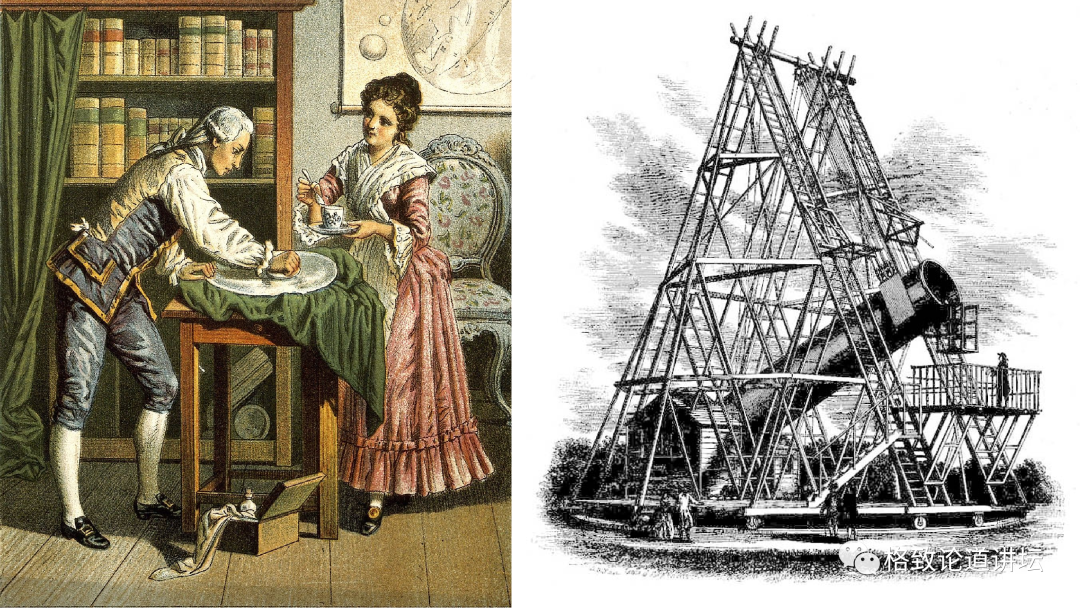 左边的这张图是威廉·赫歇尔和他的妹妹卡罗琳·赫歇尔。在17世纪末的时候,他们建造了一台在当时非常巨大的望远镜。从右图中我们可以看到,这个望远镜大概有几层楼那么高。它的主镜,即用来接收光的镜面的直径有一米多,相比之下人类的瞳孔只有几毫米。