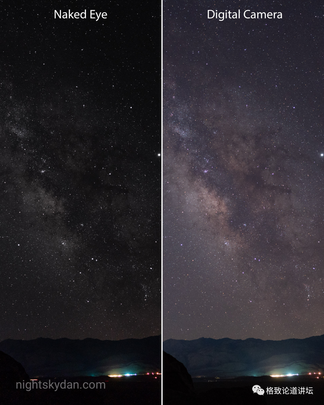 我们可以看到上图中的对比。左图是我们肉眼看到的银河的样子,而右边是我们用相机拍摄到的银河的样子。