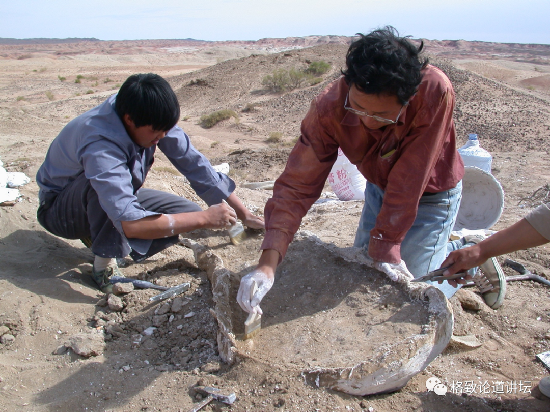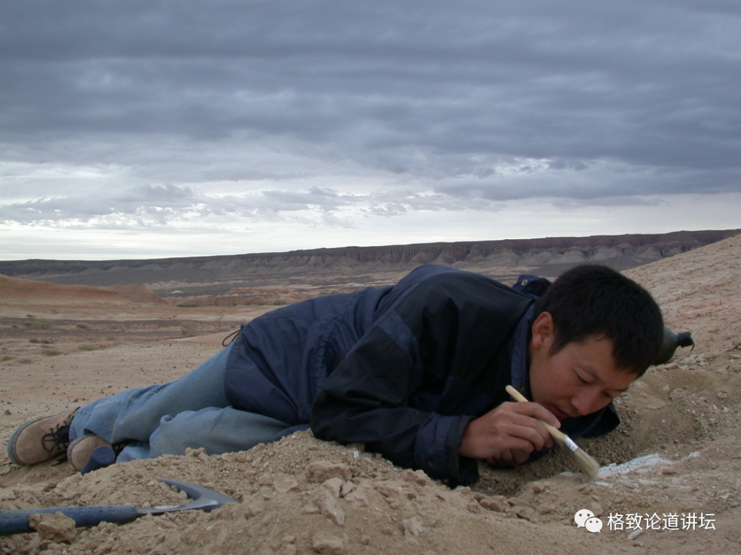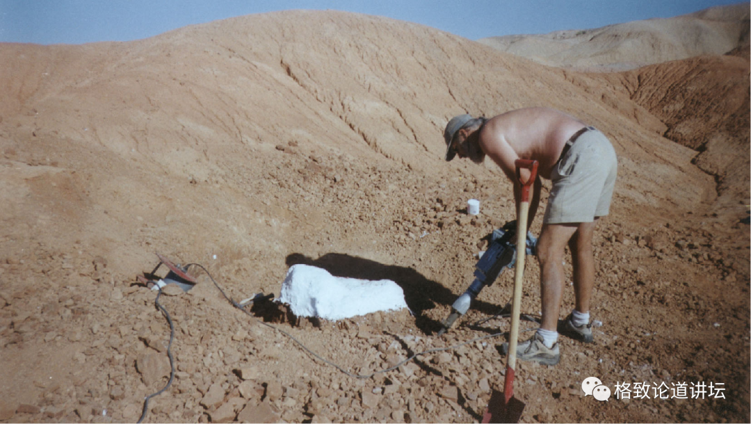 找到化石的时候并不是马上用锤子来敲,可能会把它敲坏了,而是要先用一个小刷子刷。我们要先观察这块化石是这只动物身体的哪个部位,然后观察这块化石的延展方向是什么。如果这里有一个头,身体往地层里延展,那很可能一只完整的恐龙都在这个地层里,我们要尽量完整地把它取回去。